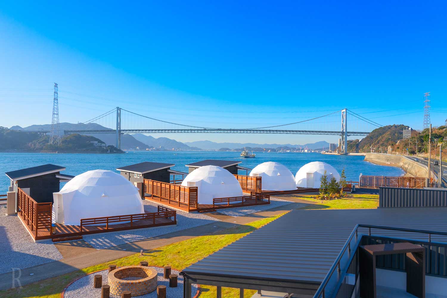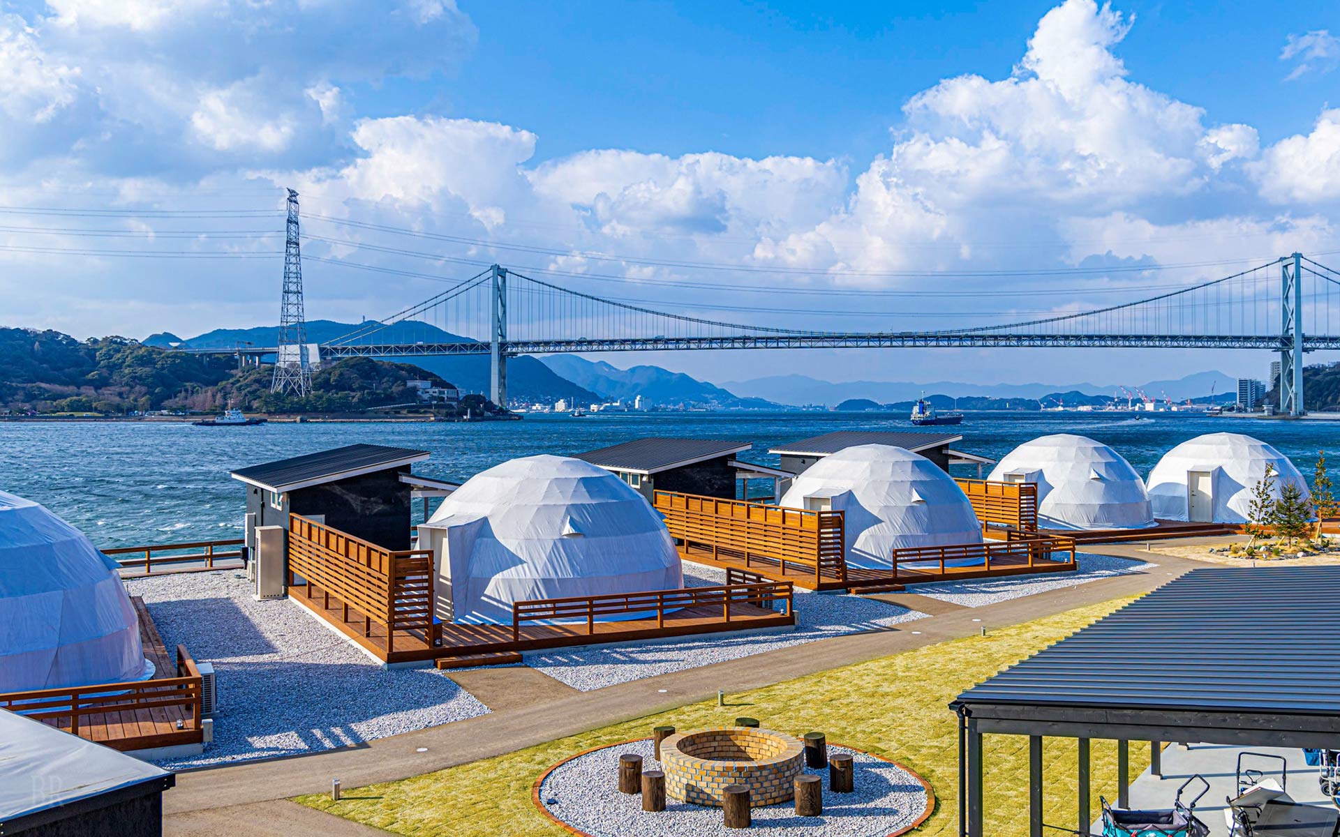 目の前に広がる関門海峡、三方を海に開かれ、緑も多く自然豊かなロケーションに恵まれた場所に位置したグランピングリゾート。