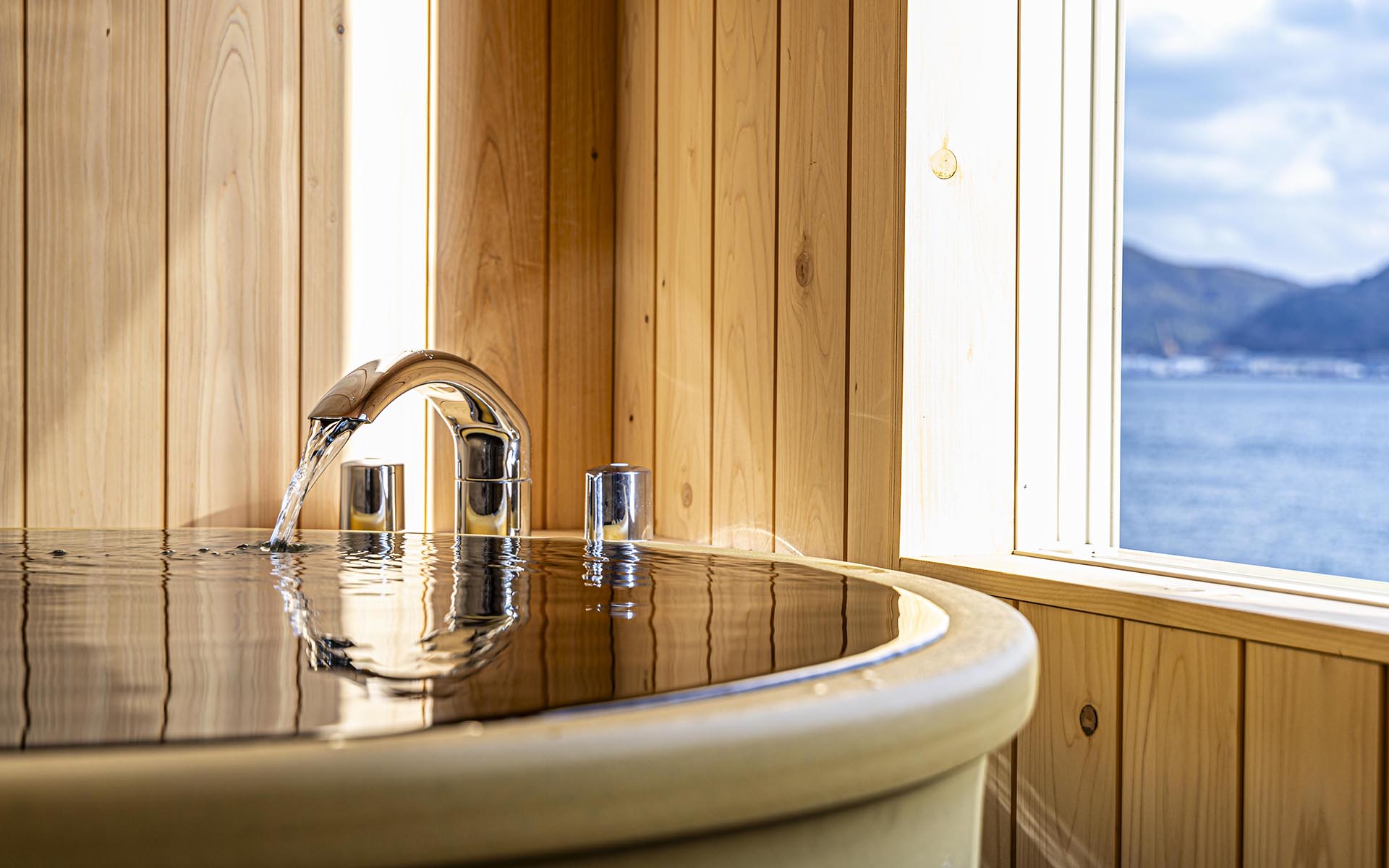 ダブルオーシャンスイート、オーシャンスイート、プールオーシャンスイートの3棟限定で、目の前に広がる海や関門海峡を眺めながら、極上の“ととのい”体験が叶う、プライベートバレルサウナをお部屋に備え付けております。